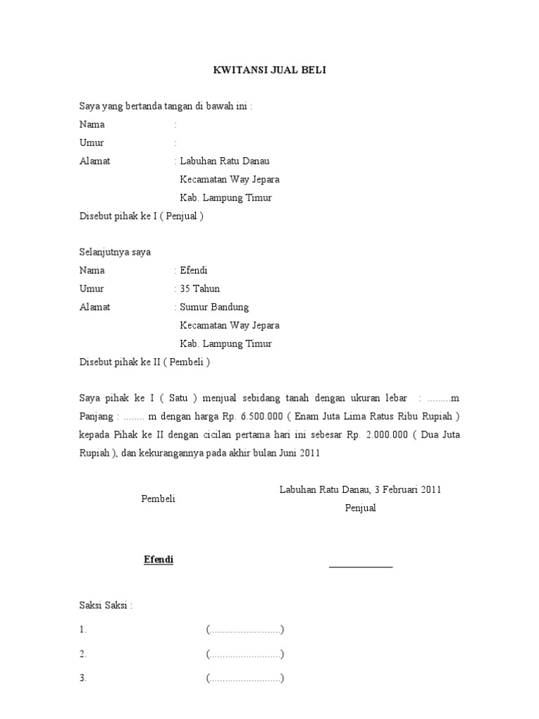 Kwitansi merupakan dokumen atau surat yang digunakan sebagai tanda bukti telah terjadinya transaksi pembayaran sejumlah uang dari orang yang memberi uang kepada si penerima uang dengan dilengkapi beberapa rincian pelengkap lainnya yakni tujuan pembayaran tanggal dan tempat dimana terjadinya transaksi pembayaran tersebut. Beberapa hal penting yang tertera di surat perjanjian jual beli tanah mungkin akan terdengar awam dan sulit di mengerti. Alih alih anda menjual tanah melalui pihak kedua bisa saja yang terjadi justru anda terlibat konflik dikemudian hari karena adanya tuntutan dari pihak lain.